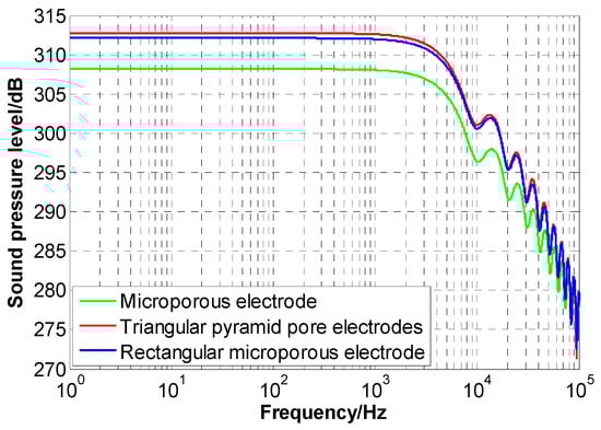 Using Equation (2), the shock wave pressures of the microporous electrode, rectangular microporous electrode, and triangular pyramidal microporous electrode are converted into sound pressure levels, followed by an FFT (Fast Fourier Transformation) transformation to plot the sound pressure level versus frequency graph as shown in Figure 9. At constant frequencies, the shock wave sound pressure level of the triangular pyramidal microporous electrode is greater than that of the microporous electrode and the rectangular microporous electrode. In the 10 kHz range, the shock wave sound pressure level of the triangular pyramidal microporous electrode reaches 313 dB, and it exceeds 270 dB in the 100 kHz range. Therefore, optimizing the cylindrical high-voltage electrode of the microporous electrode to a tip-shaped electrode with a larger curvature significantly increases the amplitude of the shock wave.