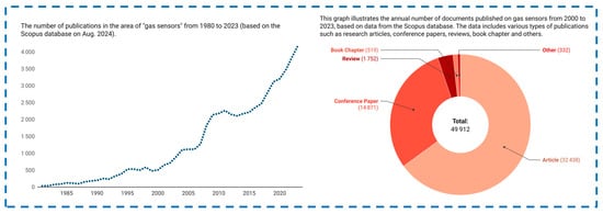 The number of publications on gas sensors from 1980 to 2023, based on data from the Scopus database.