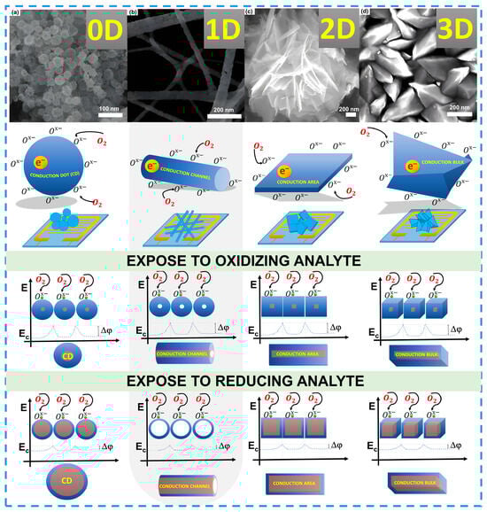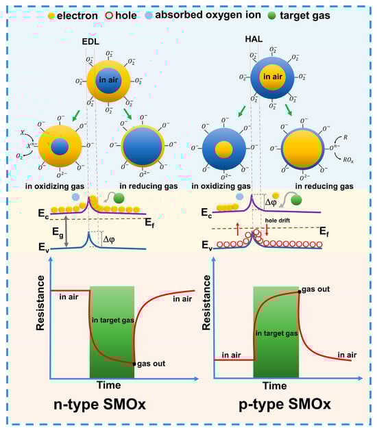 In n-type semiconductors, an electron-depleted surface layer (EDL) forms due to the extraction of electrons from the conduction band, while in p-type semiconductors, a hole-accumulation layer (HAL) develops due to the increased concentration of holes []. The polarity of the sensor response, which depends on the dominant charge carriers, significantly affects its sensitivity (see Figure 2).