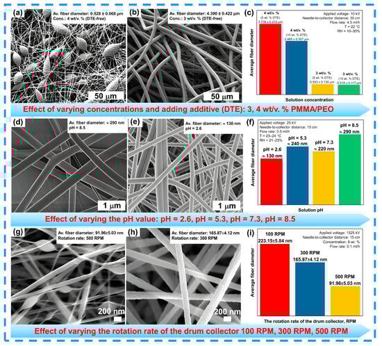 Effect of different conditions on nanofiber morphology and diameter: solution concentration (a–c), reprinted with permission from Ref. []. Solution’s pH (d–f), reprinted with permission from Ref. []. Collector speed (g–i), reprinted with permission from Ref. [].