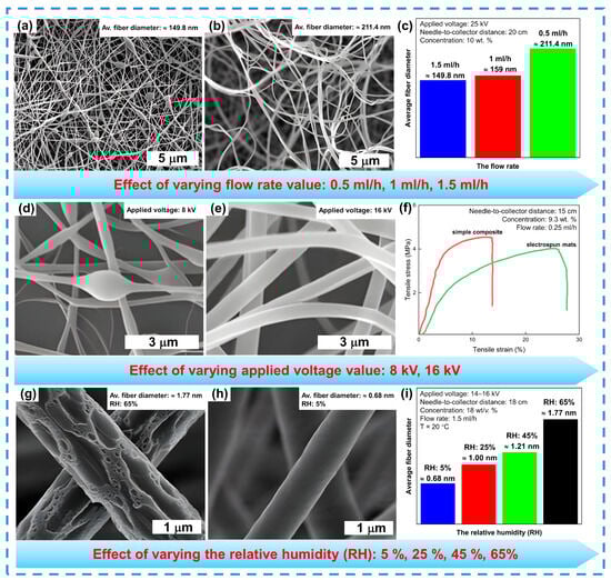 Effect of different conditions on nanofiber morphology: flow rate (a–c), reprinted with permission from Ref. []. Applied voltage (d–f), reprinted with permission from Ref. []. Relative humidity (g–i), reprinted with permission from Ref. [].