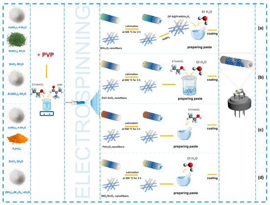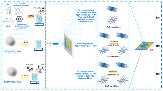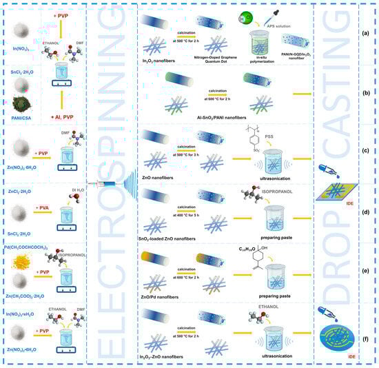 The process of making chemoresistive sensors based on electrospun nanofibers involves several key steps. The first step is to prepare the electrospinning solution, where the choice of components such as polymers, solvents, and sensing materials determine the final properties of the fibers, followed by the electrospinning process (see Figure 7).