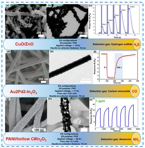 Morphology and structure of composite fibers as an example of reductive gas detection. Detection to H2S (a–c), reprinted with permission from Ref. []. CO (d–f), reprinted with permission from Ref. []. NH3 (g–i), reprinted with permission from Ref. [].