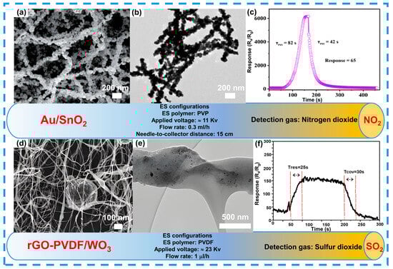 Morphology and structure of composite fibers as an example of oxidizing gas detection. Detection to NO2 (a–c), reprinted with permission from Ref. []. SO2 (d–f), reprinted with permission from Ref. [].