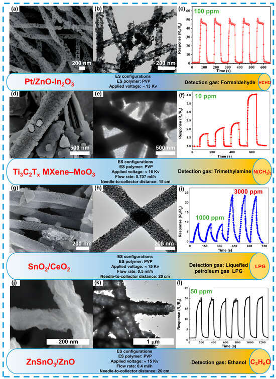 The morphology of nanofibers is also critically important for the stability and sensitivity of composite-based sensors. For example, composite fibers of CuO/ZnO synthesized via electrospinning (see Figure 10a–c) exhibit a porous and scaly structure, which contributes to high sensitivity and stability towards hydrogen sulfide (H2S) [].