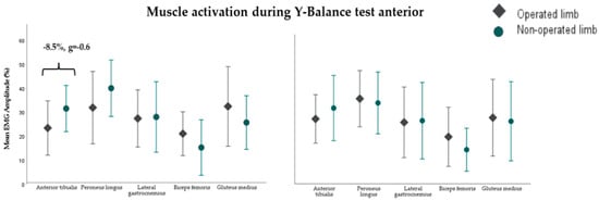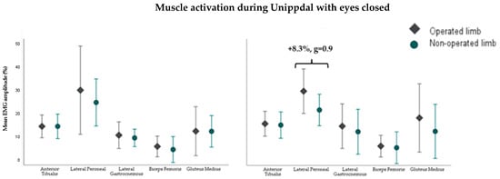 The normality of the distribution of variables was checked using the Shapiro–Wilk test. Descriptive statistics for all variables (mean and standard deviation) were calculated. To investigate the differences between the operated and non-operated limb in muscle activation of each muscle, two-way repeated measures analyses of variance (ANOVAs) were conducted, with the limb category (2 levels: operated or non-operated) and muscle category (5 levels: anterior tibialis, long peroneal, lateral gastrocnemius, biceps femoris, or gluteus medius) as within-subject factors. Likewise, repeated measures ANOVAs were performed to assess differences in the activation of distal and proximal musculature in each of the limbs or between limbs, with the limb category (2 levels: operated or non-operated) and joint category (2 levels: distal (ankle) or proximal(hip)) as within-subject factors. Pairwise comparisons were made using t-tests and corrected with the Bonferroni adjustment. Hedges’ g index (g) for paired data and its 95% confidence interval were used as estimators of effect size. A comparison was considered statistically significant when the confidence interval of the effect size did not cross the zero value. Furthermore, the practical significance of the effect sizes was interpreted as trivial (g < 0.2), small (0.2 ≤ g < 0.5), moderate (0.5 ≤ g < 0.8), and large (g ≥ 0.8) []. For Hedges’ g, positive or negative scores indicate greater or lesser muscle activation of the operated limb compared to the non-operated limb. Finally, a Pearson correlation analysis with Bonferroni adjustment was performed to evaluate the relationship between neuromuscular parameters, balance, functionality, age, and physical capacities, which showed significant differences between limbs. The statistical package SPSS (IBM SPSS Statistical v.27) was used for the analysis with a significance level of p < 0.05.