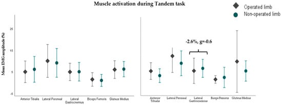 At 6 months post-surgery, during the three static balance tests, a lower coefficient of variation was detected in the operated limb’s anterior tibialis muscle (−15%, g = −0.7) and a higher coefficient of variation in the gluteus medius (+6.4%, g = 0.6) during the single-leg support test with eyes open with respect to the non-operated limb (Figure 1). At 12 months, the operated limb in the single-leg support test with eyes closed had a higher mean activation and a lower coefficient of variation of the peroneal longus (+8.3%, g = 0.9 and −10.9%, g = −0.6, respectively) (Figure 1) and in the tandem task, a lower mean activation in the lateral gastrocnemius (−2.6%, g = −0.6) (Figure 2). Readers who wish to explore the results further can access Supplementary Material Tables S1 and S2.