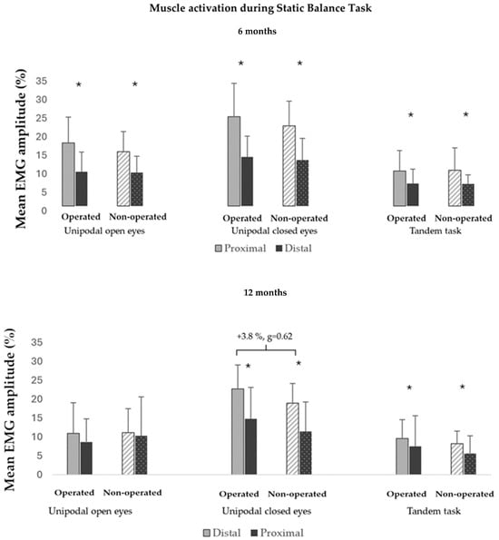 Muscle activation (distal vs. proximal) during static balance tests at 6 (up) and 12 (down) months in 14 and 21 participants after surgery, respectively. * Differences between distal and proximal muscle activation of the limb itself; } greater activation of proximal muscles during single-leg eyes-closed in the operated limb with respect to non-operated limb (+3.8%, g = 0.62) at 12 months.% MVC: average activation amplitude relative to maximum voluntary contraction (units: %).