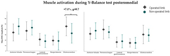 At 6 months post-surgery, the operated limb exhibited lower mean activation in the tibialis anterior muscle during the Y-Balance Test Anterior (YBTA) (−8.5%, g = −0.6) (Figure 4) and higher activation in the gluteus medius during the Y-Balance Test Posteromedial (YBTPM) (+7.1%, g = 0.7) compared to the non-operated limb (Figure 5). However, at 12 months, no significant differences in muscle activation were observed between the limbs in both YBTA and YBTPM. Additionally, no differences in muscle activation were noted during the YBT in the posterolateral direction for the five muscles of the operated and non-operated lower limbs at both 6 and 12 months post-surgery. Readers who wish to explore the results further can access Supplementary Material Tables S5 and S6.