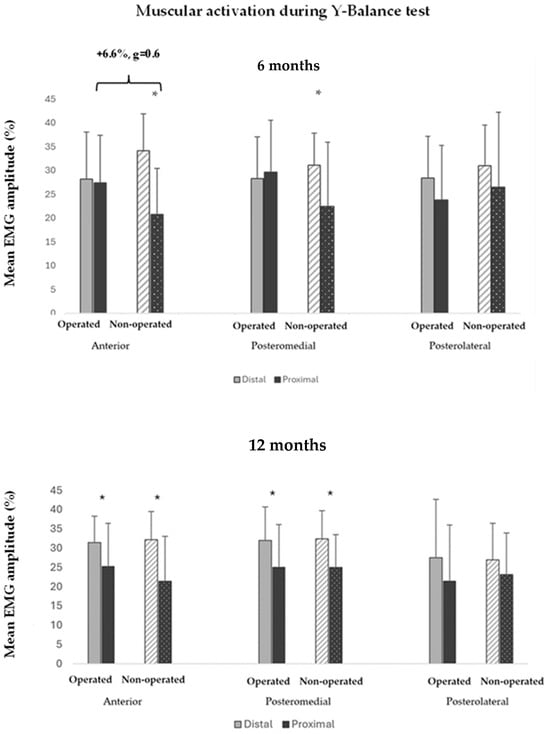 Muscle activation during the Y-Balance Test (distal vs. proximal) at 6 (up) and 12 (down) months in 14 and 21 participants after surgery, respectively. At 6 months: Y-Balance Test in the anterior direction: ANOVA interaction effect (F = 30.806 (p < 0.001)); Y-Balance Test in the posteromedial direction: ANOVA interaction effect (F = 4.121 (p = 0.065)); * differences between distal and proximal muscle activation; } greater activation of proximal muscles during YBTA in the operated limb with respect to the non-operated limb (+6.6%; g = 0.62). At 12 months, no interaction effect was found.