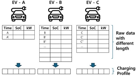Instead of utilizing direct EV operation data, one branch of research analyzes indirect data related to EV operation. This includes, for example, user surveys [8], interviews [9], GPS data [10], and artificially generated charging behaviors [11]. In terms of EV operation characteristics related to the battery, which is the core resource of EVs, a branch of research utilizes anonymized data from charging facilities. For example, in [12], the representative operating time and charging characteristics were derived based on the factors that affect the user’s charging policies. In [13], EVs were classified into two groups (i.e., personal and commercial use), and group-wise charging/operation patterns were analyzed. A two-stage clustering and entropy-weighted method was proposed in [14]. The authors classified EVs into various groups and analyzed the classification results. Furthermore, the charging behavior of EV users was analyzed from numerous public second-tier charging infrastructure data in [15]. Like the above, many research studies are conducted using data collected at an infrastructure level. In general, these datasets treat one charging session (a single instance of plugging in and charging) as one sample. Furthermore, each session is anonymized; thus, it is difficult to reflect the long-term individual characteristics of the EV. Therefore, analysis of representative patterns is derived from the statistical aspects of the overall EV user pool (e.g., charging frequency and operating tendencies).