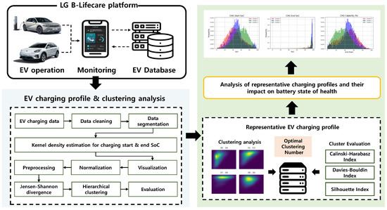 In this research, long-term vehicle-specific EV data are analyzed to derive representative EV charging patterns based on the following analytical framework. As depicted in Figure 2, first, EV driving data (e.g., charging start/end SoC, charging time, amount of energy) are collected from B-lifecare developed by LG Energy Solution.