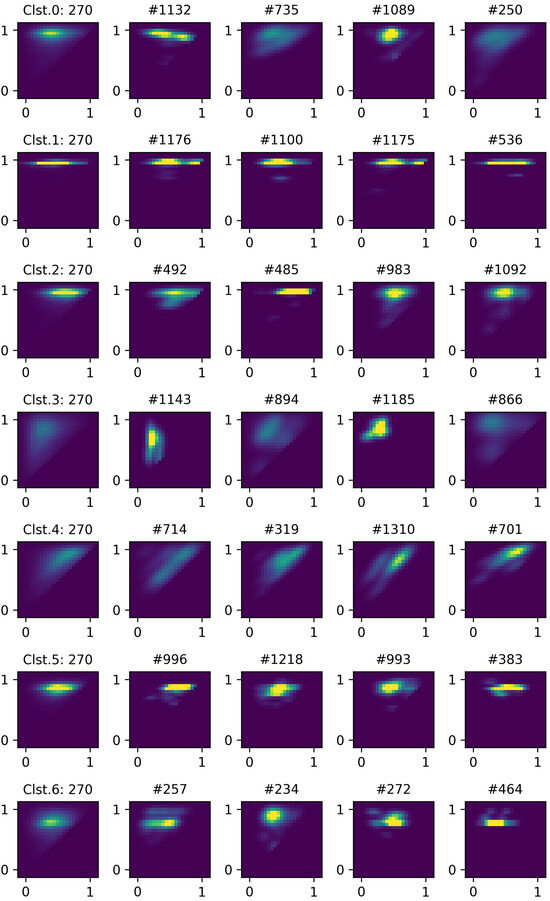 After the clustering based on the proposed framework, seven representative charging patterns (i.e., cluster average profiles) are obtained and illustrated in Figure 4. Each representative profile is shown in the form of a 2D heatmap where the average probability is depicted with color. x and y axes correspond to charging start SoC and end SoC, respectively. Note that the lower-left corner indicates an empty battery state and the upper-right corner indicates a full battery state. The boundary area of the heatmap corresponds to margins that exceed the 0 to 1 SoC range, which is intended for better visualization. First, clusters 0, 1, 2, 5, 6 show a relatively strong tendency in charging patterns compared to clusters 3 and 4. For example, cluster 1 tends to fully charge the battery regardless of charging start SoC. This characteristic appears in the form of distinct horizontal line patterns. Clusters 0 and 2 have relatively dispersed horizontal segments compared to cluster 1, indicating that charging sessions end with varying SoCs. Clusters 3 and 4 exhibit more widely dispersed patterns compared to the others. Therefore, these clusters show no dominant charging behavior, suggesting that the battery is used with a wide range of SoCs. However, differences can be found between clusters 3 and 4 as follows. First, cluster 3 shows a vertically spread pattern on the left side. This can be interpreted as users tending to start charging when the SoC level is below 50% and end charging uniformly. Cluster 4 shows a diagonally dispersed pattern concentrated on the right side, suggesting that the batteries are partially charged. In other words, since the diagonal line across (0,0) and (1,1) coordinates indicates a graph, diagonal segments in the heatmap represent that the difference between end SoC and start SoC is small. Clusters 5 and 6 have similar patterns, having dispersed oval segments around 0.3∼0.7 in the start SoC and 0.8∼0.9 in the end SoC. This type of user prefers starting charges at a moderate SoC and ending at a high but not full SoC, possibly indicating a preference for maintaining battery health and operational readiness. Next, individual charging profiles are compared with the cluster center to assess their similarity to the representative pattern.