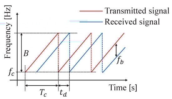Figure 1 shows the transmitted and received signals of the used MIMO FMCW radar. The FMCW radar transmits a signal called a chirp signal, which is a periodically swept microwave frequency, as shown in Figure 1. Here, and B represent the minimum sweep frequency and the bandwidth of the chirp, respectively, and represents the sweep time. In the FMCW radar system, the transmitted wave is represented by Equation (1).