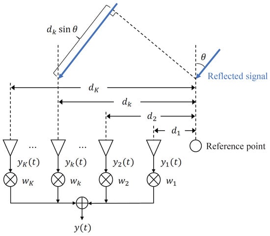 In the MIMO FMCW radar system with multiple transmitting and receiving antennas arranged linearly, a further phase shift occurs. Figure 2 shows a linear arrangement of K receiving antennas. Here, let be the angle of incidence of the reflected signal; the received signal at the k-th receiver, , is expressed by the following equation: