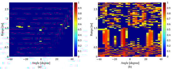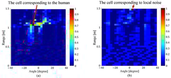 Correlation map between (a) the cells corresponding to the human location and all cells on the range-angle map, and (b) the cells corresponding to local noise and all cells on the range-angle map [17].