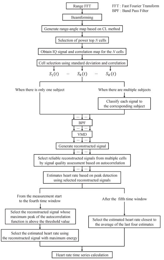 As for future works, our first priority is to improve the IMF signal selection method. In this paper, IMF signals whose center frequency is within the normal heartbeat frequency range are selected. In this case, some of the reconstructed signals generated by multiple cells contain extra peaks or signals with no clear peaks. This is considered to be due to the selection of IMF signals that are not caused by heartbeats. Therefore, we believe it is necessary to select more reliable IMF signals. As a proposal to improve the IMF signal selection method, it is assumed that the IMF signal with strong periodicity is selected based on the autocorrelation function. In addition, when multiple subjects are present within the radar coverage area, signals reflected from different persons are mixed together. Since the proposed method selects IMF signals in the general heartbeat frequency range of 0.8 to 2.0 Hz, the heartbeat components of different subjects will be included in the IMF signal when the VMD extracts the IMF signal caused by heartbeats, which may degrade the accuracy of heart rate estimation. In other words, the proposed method cannot classify the heartbeat signals of multiple subjects.