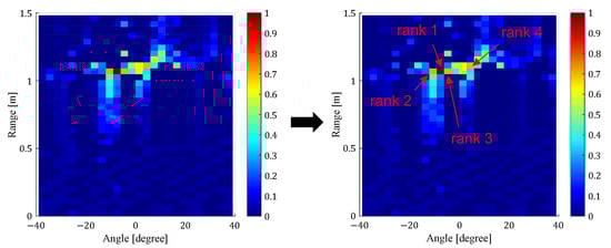 where is a CPI, and are the in-phase and quadrature signals on a specified range, angle, and is a sampling time, respectively. Next, as shown in Figure 6, the top N cells with the highest power on the range angle map calculated by the CL method are detected as candidates for cells with human presence. For each of the N-detected cells, the correlation values of the received I/Q signals with all the cells on the range angle map are calculated. To emphasize human-induced cells, only cells with a correlation value equal to or higher than 0.5 are extracted, and a correlation map of the N-detected cell points is calculated. The cells to be used for heart rate estimation are then selected based on the correlation values and standard deviation [17]. The standard deviation of the correlation value with each cell of the correlation map is first calculated. As a result, it was confirmed that the standard deviations of the cells corresponding to noise and multipath components are as high as 0.2 to 0.5, while the standard deviations of the cells corresponding to human positions are 0.02 to 0.10. To reduce the effect of local noise, the maximum correlation value between each cell and both neighboring cells is also calculated. As shown in Figure 4, the correlation values between the cell corresponding to the person’s position and the cells on both sides are as high as 0.4 to 0.7, while the correlation values between the cell corresponding to local noise and both neighboring cells are as small as 0.1 to 0.3. Based on the above, among the top N cells, all cells that satisfy both a standard deviation of 0.2 or less and a maximum correlation value of 0.4 or more with their respective two neighboring cells are selected as cells corresponding to the human position. In this study, each threshold value was selected empirically. If there is only one subject, the received signals in the selected cells are used to estimate the heart rate. If there are multiple subjects, each selected cell is classified as to which subject it corresponds to. Specifically, the distance and angle between cells selected as being caused by human are compared, and cells are classified as being caused by another subject if they are more than a specified distance or angle away from each other. Here, the specified distance and angle are set to 20 cm and 6°, respectively. These values are set empirically based on the fact that the size of one cell is 4 cm in distance and 3° in angle.