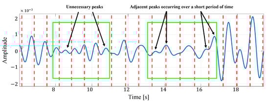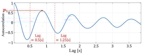 Here, L is the number of IMF signals selected, [] is each IMF signal, and [] is the energy of each IMF signal. The energy of the signal is calculated from the sum of squares of the amplitudes of each IMF signal. The signal quality assessment based on the autocorrelation value is then used to select a highly reliable reconstructed signal from the reconstructed signals of multiple cells, aiming to reduce the influence of factors other than heartbeats. The autocorrelation function of the reconstructed signal is calculated as shown in Figure 7, and peaks contained within a time interval corresponding to a normal heartbeat interval are detected. The normal heartbeat interval is 0.50 to 1.25 s. If the number of peaks detected here is one, or if the ratio of the amplitude of the second largest peak to the largest peak is less than the threshold , as shown by Equation (13), the signal is considered a reliable signal due to heartbeat and the reconstructed signal is used for heart rate estimation.