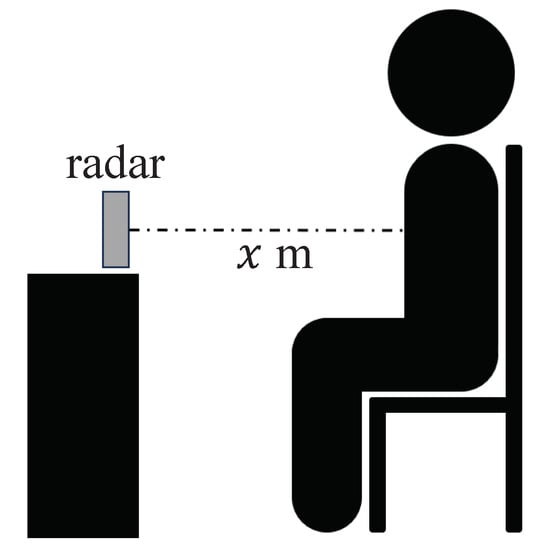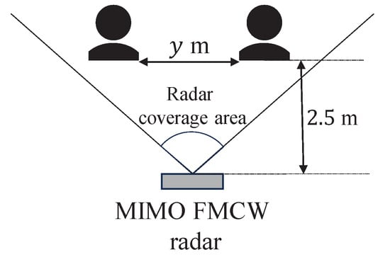 As for the experimental settings, we assumed two cases: (i) only one subject in the radar coverage area, and (ii) two subjects in the radar coverage area as shown in Figure 8 and Figure 9, respectively. In case (i), the distances between the subject and the radar were 1.0 m and 2.0 m. In case (ii), the distance between the subject and the radar was set to 2.5 m, and the distance between the two subjects was set to 0.5 m and 1.0 m. The number of subjects was four for case (i) and two for case (ii). The observation time was 2 min for case (i) and 1 min for case (ii).