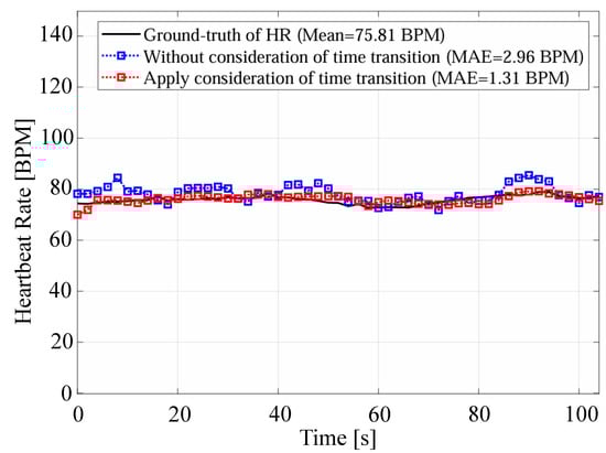 An example of the comparison of estimated heart rates with and without time transition consideration.