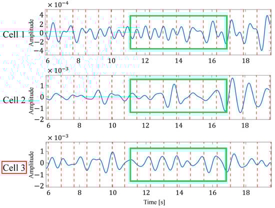 Figure 12 shows an example of the list of each reconstructed signal when selecting an appropriate signal from the reconstructed signals generated in multiple cells by considering the time transition. In this figure, the solid blue line represents the reconstructed signal and the red dotted line represents the actual heartbeat generation position calculated from the ECG. In the example in this figure, the third cell is selected as the appropriate signal. From this figure, it can be seen that some reconstructed signals have peaks close to the actual heartbeat, while others have many extraneous peaks, such as the signal in the first cell, and others have no clear peaks, such as the signal in the second cell. Therefore, the proposed method could improve the accuracy of heartbeat estimation by selecting the appropriate reconstructed signal out of these signals based on the energy or the most recent estimate.