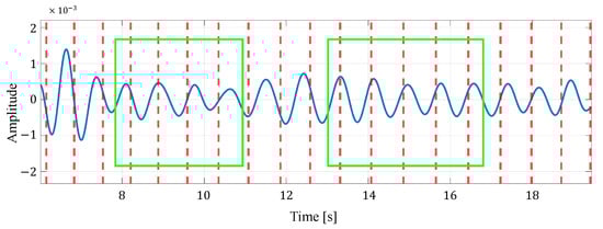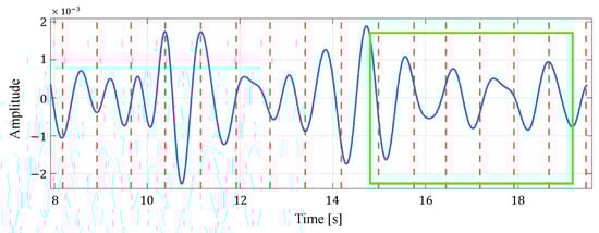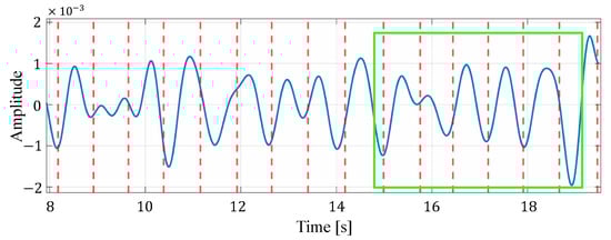Furthermore, in selecting the appropriate estimate from the estimated heart rates of multiple cells in the proposed method, we compare the case where the selection is based on only energy with the case where the selection is based on energy and periodicity. Table 9 shows the heart rate estimation results for both cases. From Table 9, it can be seen that for four data, the MAE is smaller when both energy and periodicity are considered than when only energy is considered. This is because the reconstructed signal with strong periodicity was selected so that a signal with a clear peak due to the heartbeat could be used for the heartbeat estimation. Figure 13 and Figure 14 show an example of a reconstructed signal selected based on energy only and a reconsidered painter signal selected based on energy and periodicity, respectively. Figure 13 shows that the amplitude of the signal is not as constant as the signal in Figure 14, but the peak occurs relatively close to the heartbeat position of the true value. This indicates that, in the reconstructed signal selected, based on the energy and periodicity that Figure 14 shows, a small component attributable to the human heartbeat has been excluded from the estimation. For this reason, we consider that, in case (i), the MAE was degraded in some data by considering both the periodicity and energy of the reconstructed signal.