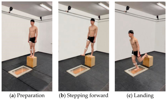 During the experiment, participants were topless, barefoot, and wearing tight shorts. A five-minute warm-up was performed before the formal test. The warm-up session was conducted in accordance with the routine previously employed by the participants prior to their daily volleyball training sessions. This routine included dynamic stretching of various body parts and jogging. Before the warm-up, the instructions on how to complete the single leg landing task were explained and displayed to them. In each trial, the participants were asked to perform three single leg landings from a 45 cm box as naturally as possible with a toe–heel touchdown and then leave the force platform (Figure 1). A successful trial was recognized if they landed on the force platform using the dominant leg and walked out of the force platform completely.