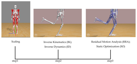 In order to simulate the single leg landing maneuver, the “Gait 2354_Simbody” model (https://simtk.org/projects/ulb_project) in OpenSim (4.2, Simtk.org) was accessed on 7 May 2022. Participants were given head circumference, chest circumference, bilateral arm length, palm width, waist circumference, bilateral thigh length, knee width, bilateral calf length, and bilateral foot length measurements before the start of the experiment for use in personalized model building during the simulation (Table 2). The procedure of scale was adapted to match the anthropometric parameter of each subject. A series of joint angles were obtained by applying inverse kinematics (IK), and moments in the lower limb were obtained by running the inverse dynamics (ID). The inconsistencies between the measured kinematics and the GRFs were minimized using the residual reduction algorithm (RRA), such that a modified body model was realized and static optimization (SO) was utilized based on the RRA to calculate the muscle force (Figure 3). The muscle forces were normalized to the bodyweight (BW).