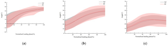 (a): ankle, (b): knee, (c): hip. These are the comparisons of the ankle, knee, and hip angles for single leg landing in non-fatigue (NF) and post-fatigue (PF) states, respectively.