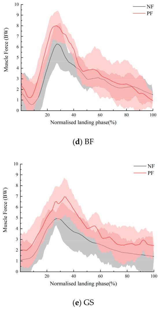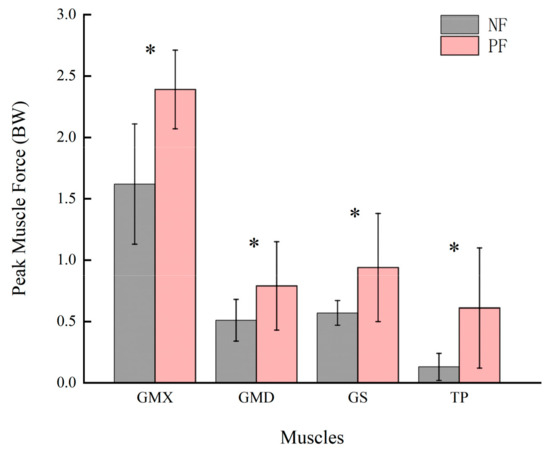 The comparison of the GMX, GMD, GS and TP’s peak muscle force for single leg landing in non-fatigue (NF) and post-fatigue (PF) states, respectively. * Significant differences with p < 0.05.