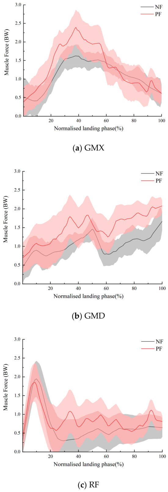 Instead, the participants chose a kind of non-conservative strategy to land. In other words, the participants adopted a more rigid landing strategy in order to bear the load from landing. Generally, as the degree of fatigue increases, the larger GRF is absorbed by the increase in the range of joint motion, which was considered a conservative protective mechanism. However, the participants in the current study did not actively control the range of motion of the joints of the lower limbs in order to increase it. An attempt was made to analyze this phenomenon from a muscular perspective. During the landing phase, the functions of the GS and TP muscles were responsible for plantarflexion and avoiding moving the tibia forward [26]. This study showed that the peaks of the GS and TP in a mild fatigue condition were significantly higher than those in a non-fatigue condition. In order to keep the body balanced, the participants had to raise the muscle force of the GS and TP to avoid excessive dorsiflexion of the ankle joint and flexion of the knee joint during single leg landings. Agonist and antagonist co-activation plays an important role in stabilizing the knee joint, especially after fatigue [27]. Nevertheless, in our study, the ankle joint was observed to be in passive dorsiflexion at the commencement of the landing phase. However, due to the passive nature of the movement, the muscle force of the tibialis anterior (TA), which is the agonist muscle, did not exhibit a significant increase during passive dorsiflexion, which may be one of the reasons why the ankle dorsiflexion angle did not increase but decreased. Unlike the muscle fatigue caused by medium or severe fatigue, mild fatigue does not cause a decrease in the muscle force, but it rather increases it, thus controlling the movements [28]. However, this might not necessarily appear to be a positive change, because increasing the hip–knee–ankle flexion angle during landing can prevent the bones and ACL from bearing more of the impact when absorbing the GRF, reducing the risk of injury [29,30].