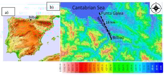 The research area covers the Basque Country, located in the northern part of the Iberian Peninsula, bordered by the Pyrenees and the Cantabrian Mountains. This area features a varied topography with moderately low mountains, the highest of which range from 1000 to 1500 m above sea level, and narrow valleys that shape its terrain. Bilbao, the largest city in the Basque Country, with a population exceeding 340,000 inhabitants, is situated in the Nervión valley, approximately 16 km inland from the Bay of Biscay (Figure 1). Meteorologically, Bilbao experiences a temperate maritime climate strongly influenced by its proximity to the Atlantic Ocean. The city receives significant annual rainfall, averaging over 1000 mm, which is evenly distributed throughout the year, with relatively higher precipitation in the winter months. The prevailing wind directions in Bilbao are from the south and north [10], due to the channeling effect created by the surrounding mountains and valleys.