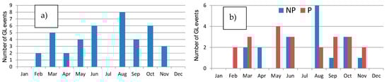 (a) Total number of GL events and (b) GL with precipitation (P) and non-precipitation (NP) in each month during the period 2009–2018.