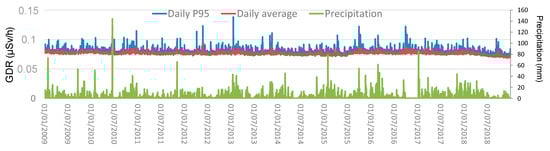 The correlation values obtained between the daily mean values and the 95th percentile with precipitation show an increase, from 0.27 for daily mean values to 0.34 for P95 daily values, suggesting that precipitation is one of the primary drivers of reaching high GDR levels at this location. In this sense, the average during the whole period 2009–2018 of daily and P95 GDR concentrations are higher under precipitation (0.07655 ± 0.00001 µSv/h and 0.0811 ± 0.0002 µSv/h, respectively) than without precipitation (0.0759 ± 0.0008 µSv/h and 0.07955 ± 0.0008 µSv/h, respectively).