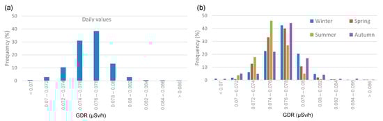 (a) Total and (b) seasonal histogram of GDR daily values during 2009–2018 in Bilbao.