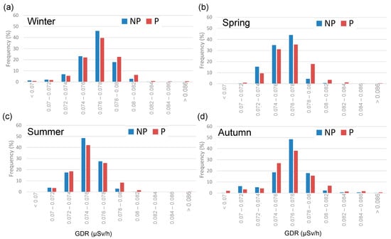 Finally, the influence of precipitation days on the GDR values is shown in Figure 5, which displays histograms for each season, comparing the GDR concentrations on days with precipitation (P) and without precipitation (NP). Seasonal variations in GDR concentrations are observed, with higher values typically recorded in autumn and winter compared to summer [14]. P and NP days present the maximum frequency in the range “0.076–0.078” µSv/h in winter, spring, and autumn, while this peak is reached in summer in a lower range “0.074–0.076”. NP days generally have higher frequencies of lower GDR concentrations across all seasons, while, on the contrary, P days exhibit a higher frequency in the highest values, presenting a broader distribution of GDR concentrations. These results demonstrate the significant influence of precipitation on GDR concentrations, primarily due to the washout effect, where rain brings airborne radionuclides closer to the ground, leading to increased GDR levels during and shortly after rainfall events [15]. Additionally, the accumulation of water on the ground can slightly reduce radon outgassing, tempering the increase in GDR. This seasonal pattern can be attributed to several factors, including increased radon exhalation from the soil during colder months and the accumulation of radionuclides on the ground surface, which are then washed out by precipitation [10].
