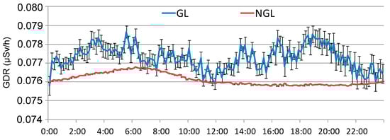 In this section, 40 days with GL events from the period 2009 to 2018 are analyzed, all of which have sufficient hourly GDR data available. Figure 6 shows the overall average daily GDR cycle in Bilbao without GL (NGL) and the GDR cycle under GL events (GL). On average, GDR values under GL are higher throughout the entire day. It is notable that both cycles exhibit high values during the night, followed by a decline to lower values. However, from midday onwards, GDR concentrations rise under GL events, with an increase from 12:00 h to 20:00 h, after which they begin to decrease. This increase coincides with the period established in [9] for the development of GL. Therefore, the GDR cycles in Bilbao reveal distinct daily patterns, suggesting a positive influence of GL formation in GDR levels during the afternoon, emphasizing the impact of atmospheric conditions on radiation levels throughout the day.