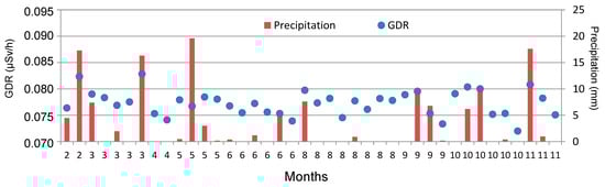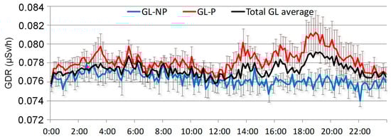 GL events can be developed with and without precipitation [9]. Figure 7 displays the set of 40 days of GL covering the period from 2009 to 2018, indicating the total precipitation recorded for each one, as well as the daily average value of GDR. On days with precipitation, the average of GDR is higher (0.0781 ± 0.0005 µSv/h) than the average value on days without precipitation (0.0763 ± 0.0005 µSv/h). The average value ranges from 0.0733 µSv/h to 0.0828 µSv/h in precipitation days, while it ranges from 0.0720 µSv/h to 0.0790 µSv/h in non-precipitation days.