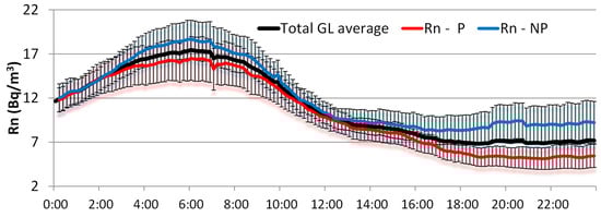 Daily cycles of radon concentrations under GL events with precipitation (GL-P), non-precipitation (GL-NP), and the overall average during the period 2009–2018.