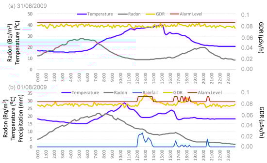 Two study cases of the GDR evolution under the GL situation are represented in this section, the first one under dry conditions (31 August 2009) (Figure 10a), and the second one under wet conditions (1 August 2009) (Figure 10b). The daily evolution of temperature, radon concentration, and GDR is illustrated in figures that capture data every 10 min. The red horizontal line represents the alarm level for GDR under dry or wet conditions, respectively. This line, in agreement with Section 2.4, presents different values under precipitation and without precipitation.