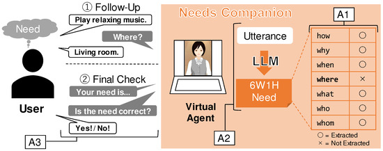 Figure 1 shows the flow of needs elicitation through VA dialogue. The VA engages in dialogue with the user to elicit their needs. Based on research showing that needs-related experiences and behaviors become clear through language, this dialogue aims to surface needs [36]. The key steps of needs elicitation are clarification and final confirmation. If the extracted needs data are missing any 6W1H elements, the VA identifies this and asks the user for clarification to gather more detailed needs. The user, prompted by this request, reconsiders their needs and responds to the VA with any additional needs. While user awareness of needs is not essential for deriving satisfaction from fulfilling them, such awareness and externalization are necessary for detecting needs from the outside. Reconsideration of needs promotes this awareness. In the final confirmation, the VA asks the user directly if the detected 6W1H needs data are accurate. This step improves the accuracy of the needs detection and enhances the user’s sense of autonomy and competence, making them feel more satisfied when their needs are fulfilled [37,38].
