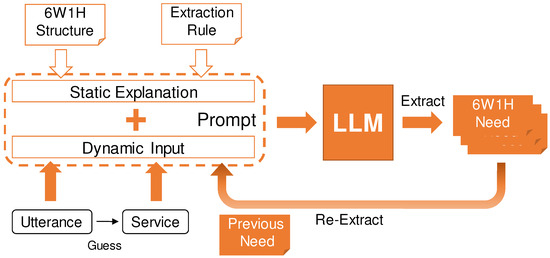 Using an LLM, 6W1H needs data are extracted from user utterances. The flow of needs extraction is shown in Figure 2. First, as a preparation for needs extraction, the system infers which service the user wants to use. This inference can be performed using a pre-prepared list of service names for string search or by generating service names with the LLM. During needs extraction, the user’s utterance and the inferred service name are input into the LLM. The prompt includes the content from Table 1 to explain the 6W1H needs data model, along with detailed extraction rules to refine the output. Specifically, the prompt instructs the system to always extract the how and what elements, which are foundational to the needs, and to prioritize the extraction of finer-grained elements like when and where elements over the more abstract why element. The extracted output is the 6W1H needs data. There are two important considerations for extraction. First, a single utterance may not refer to only one need; multiple service needs may be extracted simultaneously. Second, if the utterance does not mention a time reference, the ‘when’ element cannot be extracted, so it is not always possible to obtain all 6W1H elements in a single extraction. Therefore, a re-extraction mechanism is needed to update the previously extracted 6W1H needs data based on additional user input. During re-extraction, the system inputs both the new user data and the previously extracted 6W1H data into the LLM. By calculating the similarity of needs, the updated needs are identified from multiple needs outputs, maintaining the consistency of re-extraction.