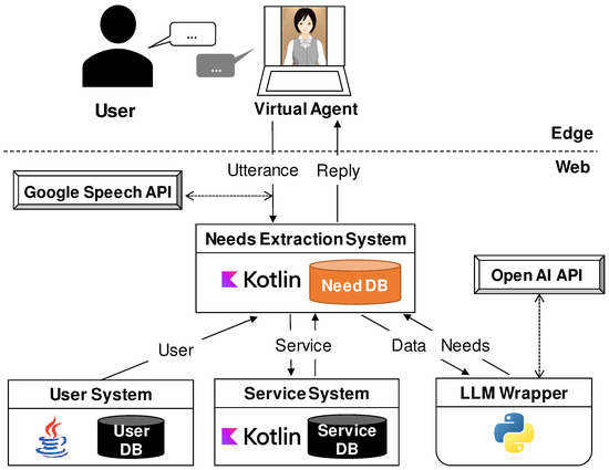 Figure 3 illustrates the implementation architecture. The VA, called Mei, runs on a PC browser [9]. Users interact via voice, and the system responds with voice, on-screen avatar gestures, expressions, and text. The system has a simple interface and responsive interactions from the VA, designed to be user-friendly even for older adults unfamiliar with digital devices. The dialogue screen is shown in Figure 4. The system uses the Google Speech API for voice recognition [39]. It is built on the Java virtual machine with three components, each having its own database: the Needs Extraction System, the User System, and the Service System. The Needs Extraction System has a needs database that stores 6W1H needs data. The User System manages user information, while the Service System allows pre-registration of service names and stores newly discovered service names from user utterances. The LLM runs through an LLM Wrapper implemented in Python 3.9, integrating prompts and settings to run the OpenAI API [40]. When the system was built in early 2024, OpenAI offered two models: the high-performance gpt-4 and the more affordable gpt-3.5-turbo. Given the high frequency of LLM usage in the proposed system, gpt-3.5-turbo is chosen for its practicality and cost-effectiveness. To ensure accurate needs extraction, the sampling temperature is set to 0.0. Few-shot prompting is utilized in the prompts, providing several examples of input and output [41]. In this implementation, four systems were constructed on the web, but flexible operations are possible, including handling personal information on an on-premise server or deploying these systems on a cloud using virtual servers. Cloud services like the Google Speech API and OpenAI API are used, leveraging cloud computing resources. However, the response time and control over output results using these APIs can be challenging.