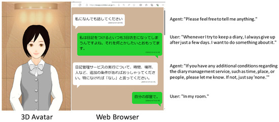 - Ozono, H.; Chen, S.; Nakamura, M. Encouraging Elderly Self-care by Integrating Speech Dialogue Agent and Wearable Device. In Proceedings of the 8th International Conference, ITAP 2022, Held as Part of the 24th HCI International Conference, HCII 2022, Virtual, 26 June–1 July 2022; Volume LNCS 13331, pp. 52–70. [Google Scholar]