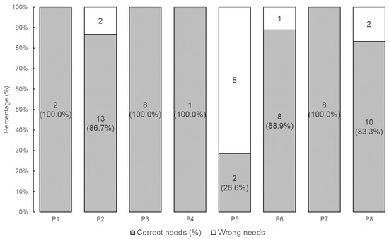 We evaluated whether users judged their needs to be correctly detected during the final confirmation of the dialogue. This evaluation was based on whether the users responded “Yes” or “No” to the confirmation. A total of 88 dialogues were conducted across all participants. For each participant, the proportion of dialogues that continued until the final confirmation is summarized in Figure 5, and the proportion of “Yes” responses to the final confirmation is shown in Figure 6. As a result, 83.9% of the needs were judged to have been correctly understood out of the 62 dialogues that reached the final confirmation. Notably, P5’s low accuracy was mainly due to frequent speech recognition errors.