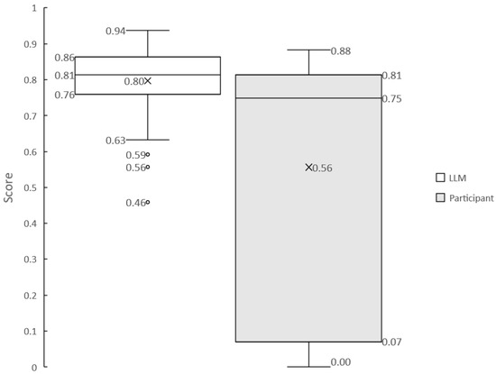 We used G-Eval to assess whether the LLM accurately converted users’ utterances into needs [42]. G-Eval is a tool that uses ab LLM to evaluate natural language generation (NLG) tasks, scoring them from 0 to 1 based on specific criteria. It is not necessary for the LLM model used for the NLG task to match the one used for evaluation in G-Eval; the higher the performance of the evaluation model, the more reliable the assessment. Therefore, gpt-4o model, which outperforms gpt-3.5-turbo, was employed for evaluation [43]. Because user utterances can be affected by microphone accuracy, speech recognition, and colloquial language, we compared the LLM-generated needs (without noise) to the actual spoken utterances to assess noise reduction. The evaluation prompt was “Evaluate whether the user’s request has been accurately and truthfully converted into a structured 6W1H needs format. The 6W1H structure is represented by where, when, who, whom, why, what, and how. The input consists of the user’s request statement and a list of potential service names that might be included in the request. It is acceptable for any 6W1H elements that are not present in the request text to be left blank in the output”. The number of needs utterances evaluated was 100 for the LLM-generated ones and 59 for the actual utterances by participants. The box plot of the resulting scores is shown in Figure 7.