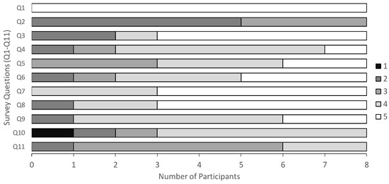 Participants responded on a five-point Likert scale, where one means strong disagreement and five means strong agreement [44]. Questions Q1 through Q4 focused on understanding the participant characteristics. Question Q5 assessed the practicality of Needs Companion, Q6 and Q7 its reliability, Q8 its effectiveness, Q9 its efficiency, and Q10 and Q11 its pleasantness. These survey items were defined according to the SQuaRE software quality evaluation standards [45].