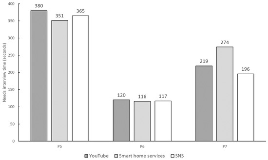 This study is the first to propose extracting needs using the 6W1H format, meaning no prior research exists on human-based 6W1H extraction. To address this, we conducted an interview experiment to compare the performance of Needs Companion with human interviews. In the experiment, one person acted as the interviewer, and the other as the user. The interviewer gathered the user’s service-related needs and organized them into the 6W1H format. Afterward, the interviewer asked the user to confirm whether the needs were accurately summarized. To reduce bias, three software students, who did not participate in the main experiment, conducted the interviews. Three participants from the main experiment (P5, P6, and P7) took on the role of users. Each pair assessed needs for three services: YouTube, smart home services, and SNSs. Nine total assessments were completed. In eight cases, users confirmed the needs as correct, while one case received a “not my need” response. Figure 12 shows the time spent on each assessment, with the average being 237.6 s.