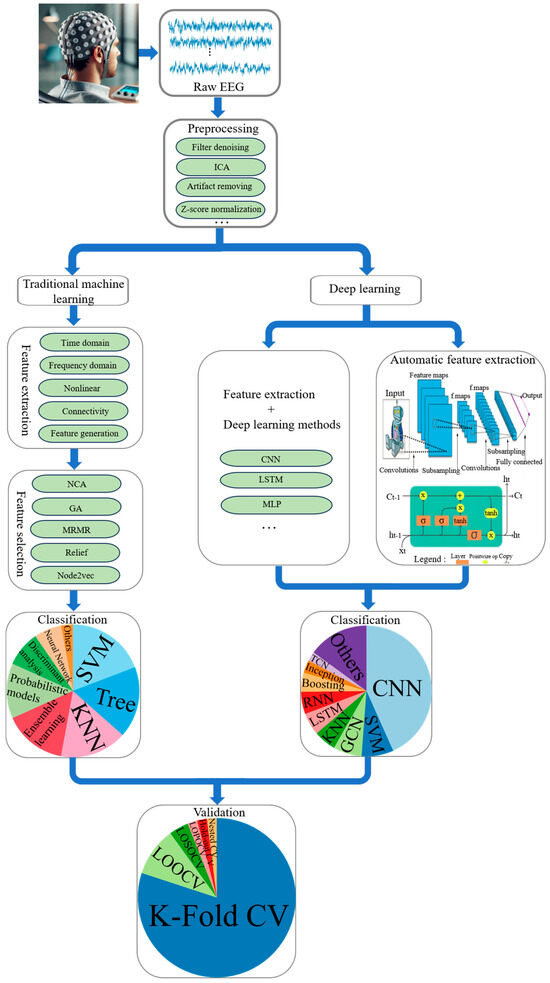 The preprocessing methods outlined above can be divided into two primary categories: automatic and semi-automatic or manual. In automatic preprocessing methods, tools such as EEGLAB and BESA rapidly process large volumes of EEG data, minimizing human intervention with techniques such as filtering, ICA, and normalization. This approach is especially well-suited for large-scale data analysis. Automated methods ensure consistency in preprocessing steps. For example, the use of uniform filters and standardization algorithms produces reproducible results across experiments, thereby enhancing the study’s reliability. FastICA and ANC effectively extract and remove artifacts and enhance signal-to-noise ratios, thereby improving signal quality. Typically, these methods can rapidly identify and eliminate artifacts caused by eye movements or other biological signals. However, automatic preprocessing can alter the intrinsic dynamics of the signal, especially when techniques such as ICA are employed [106]. Incorrect component identification may lead to the loss of crucial signal features. Among semi-automatic or manual preprocessing methods, the manual approach allows researchers to tailor the preprocessing strategy to specific experimental requirements. Expert visual inspection ensures the accuracy and integrity of the signal and minimizes potential distortions. Expert intervention facilitates more efficient identification and handling of outliers, thereby preventing the omission of important signals that may be overlooked by automated processing. This approach generally preserves more information and minimizes alterations to the signal. Although semi-automatic or manual methods can enhance data quality, insufficient sample sizes may lead to both the training and test sets containing the same individuals, thus impairing the model’s generalization capabilities. In conclusion, automatic preprocessing methods provide significant advantages in terms of efficiency and consistency, making them ideal for large-scale data analyses. However, they may also alter the signal characteristics. Conversely, semi-automatic or manual methods offer enhanced flexibility and improved control over signal quality, thereby allowing for the retention of more useful information.